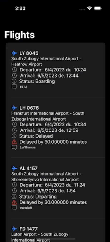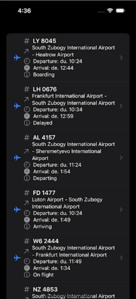 - Departures: Similar to arrivals, this screen displays a list of departing flights.