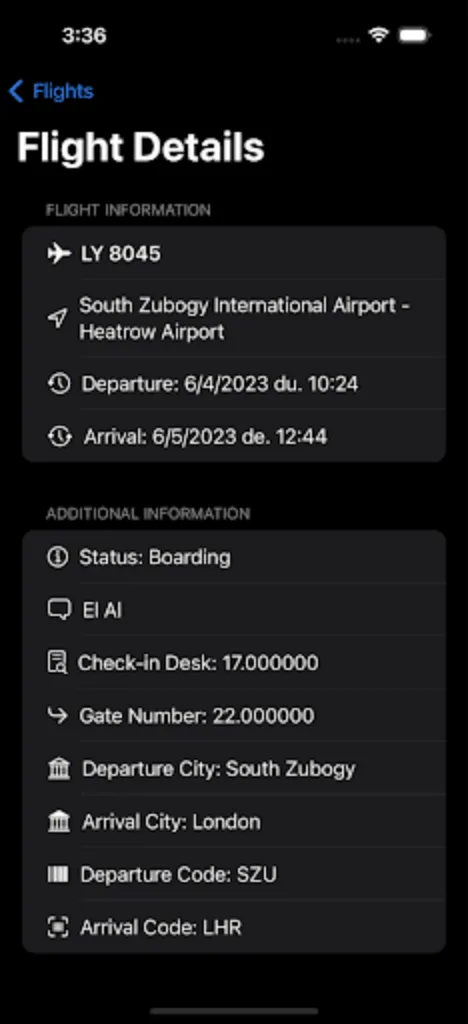 - Favourites: Users have the option to mark specific flights as favourites, which are then saved locally on the device for easy access.