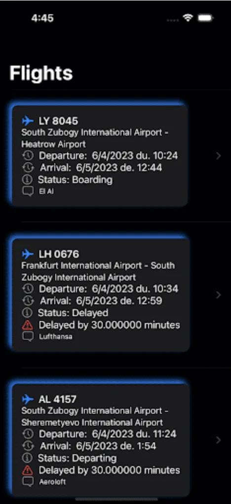 For this test of AI tools, our iOS developers at Zenitech worked on an application for a fictional airport. The task was to create a feature-rich iOS app that integrates multiple screens, network communication to fetch real-time data, and local persistence for user-specific information.