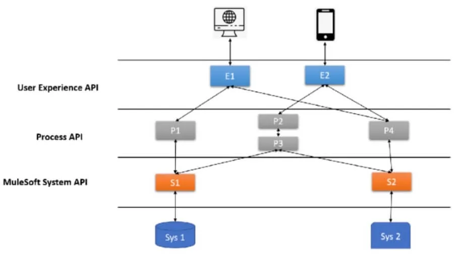 Every organisation has a lot of microservices and systems like SAP systems, REST APIs, Mqs, Salesforce and DBs. These connections are created into a layer called the system layer. Above this layer will sit the process layer, which contains composite APIs/applications (this layer represents the core of processing). It contains processes connected to the system APIs, taking the needed data and binding it through a chain of calls, delivering a specific data set.